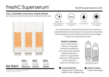 Ingredient Spotlight: Vitamin C (L-Ascorbic Acid): It’s no secret that L-Ascorbic Acid (Vitamin C) is skincare royalty! Backed by decades of clinical research, this powerful antioxidant protects against environmental stressors, boosts collagen production, brightens and evens skin tone. The problem... In conventional serums, L-Ascorbic Acid quickly oxidizes rendering it ineffective. The solution... freshC Superserum! Our unique, dual chambered bottle isolates pure L-Ascorbic Acid to maintain freshness for 100% potency, and a full dose of Vitamin C with each use.